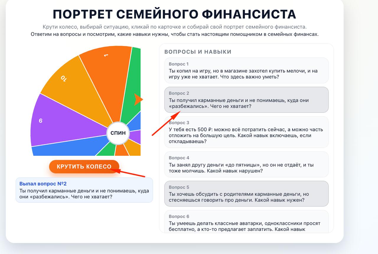 Знакомство с курсом и моделью навыков начинается с онлайн игры "Портрет семейного финансиста". Ребята крутят спинер, читают вопрос, отгадывают, какие навыки за этим стоят, спорят, ищут решения — и вдруг понимают: финансовая грамотность — это про них, а не “для взрослых”.